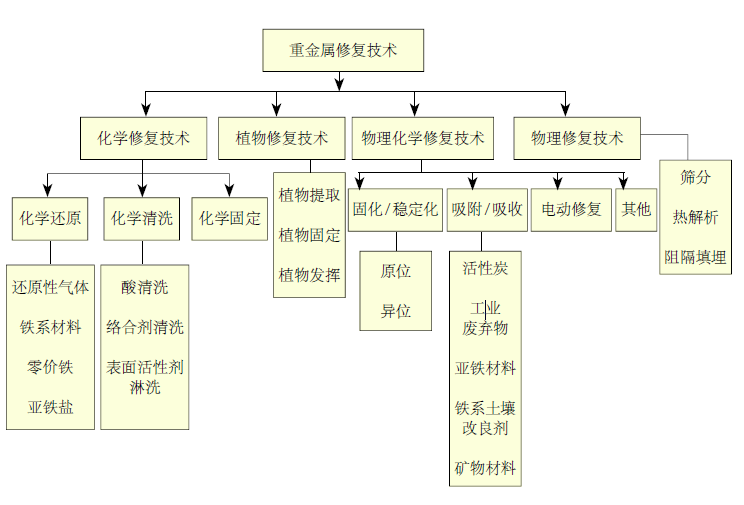 重金屬污染土壤修復(fù)指利用物理、化學(xué)和生物的方法轉(zhuǎn)移、吸收、降解和轉(zhuǎn)化土壤中的重金屬,使其濃度或毒性風(fēng)險(xiǎn)降低到可接受的水平,滿足相應(yīng)土地利用類型的要求。重金屬修復(fù)從治理途徑上可分為兩種,一種是改變重金屬在土壤中的存在形態(tài),使其固定,降低其在環(huán)境中的遷移性和生物可利用性;另一種是從土壤中去除重金屬,使其存留濃度接近或達(dá)到土壤重金屬背景值或標(biāo)準(zhǔn)。從治理技術(shù)上可以分為物理修復(fù)技術(shù)、化學(xué)修復(fù)技術(shù)、物理化學(xué)修復(fù)技術(shù)和植物修復(fù)技術(shù)。