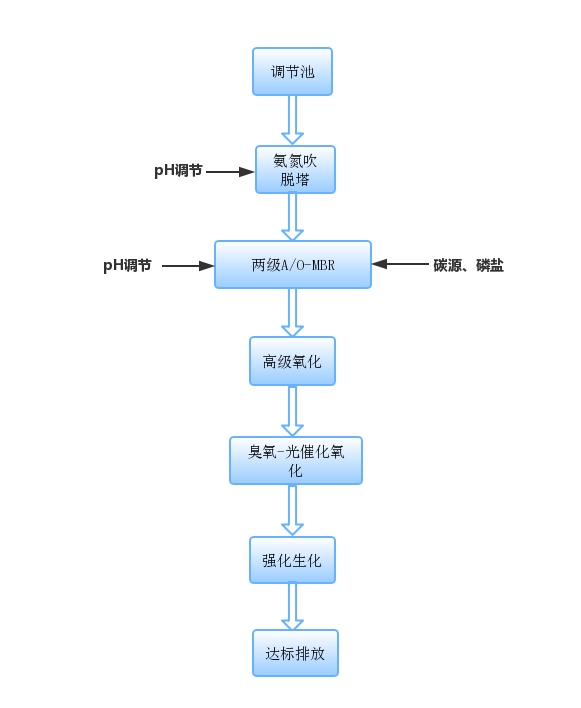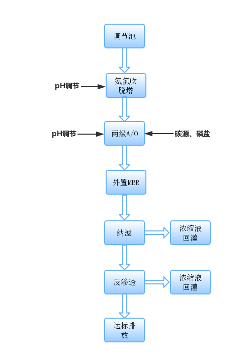 調(diào)節(jié)池進水提升至氨氮吹脫塔,在pH為9-10的條件下,pH能從幾千將至300mg/L以下,然后經(jīng)過兩級硝化——反硝化,去除大部分COD、氨氮和總氮,最后經(jīng)過三級膜處理,使出水達標(biāo)。